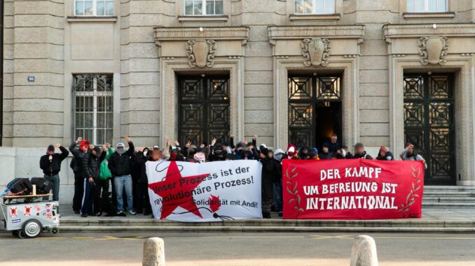 Heute folgten ca. 80 solidarische Menschen dem Aufruf sich anlässlich des Prozesses gegen die Genossin Andi vor dem Bezirksgericht Zürich zu besammeln. Mit Transparenten und Musik versammelten wir uns vor dem Gericht und verleihten dem ruhigen Mittwochmorgen eine kämpferische Stimmung.